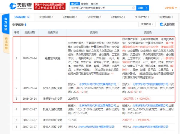 网易科技讯 9月25日消息,天眼查数据显示,9月24日,抚州快乐时代科技发展有限公司发生经营范围变更,新增第二类增值电信业务中的呼叫中心业务、增值电信服务等。同时,注册资本也由原来的200万人民币增加至1000万人民币。