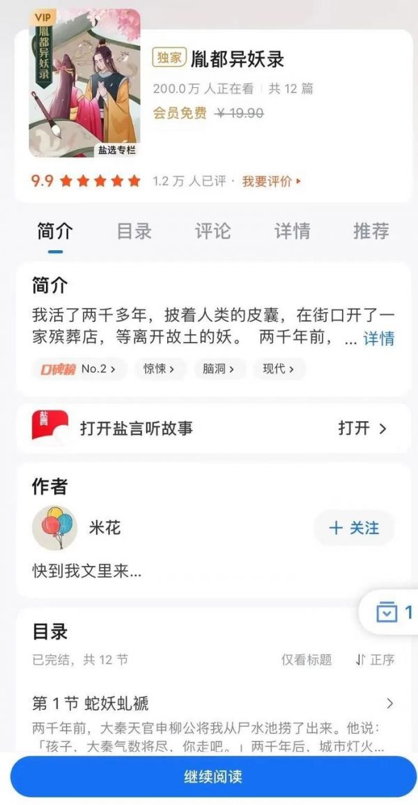评分高达9.9分的《胤都异妖录》是知乎创作者「米花」的一部神作。从小熟读古典书籍的「米花」将中国神话志怪小说中记载的荒诞古怪故事、奇异走兽与现代生活结合,架构出一部现代捉妖故事,其中,缠绵悱恻的爱情、敢爱敢恨的妖怪都为读者留下了深刻的印象。