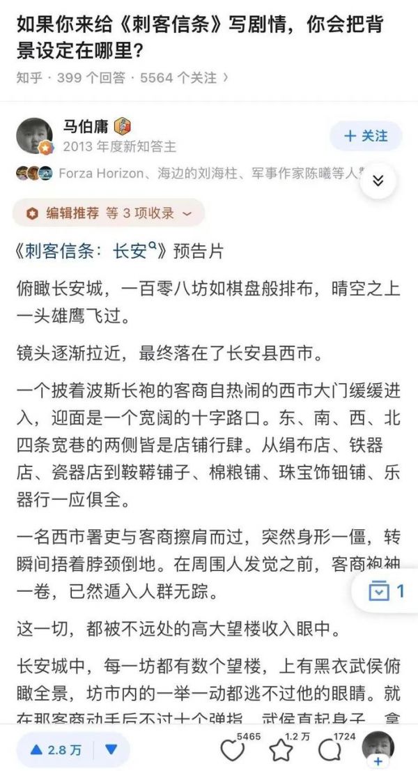 最为行业津津乐道的一个案例是「马伯庸」创作《长安十二时辰》的历程,这部小说后来被改编成火爆一时的同名剧集。然而,这一IP起初只是源于知乎上一个「如果你来给《刺客信条》写剧情,你会把背景设定在哪」的问题。