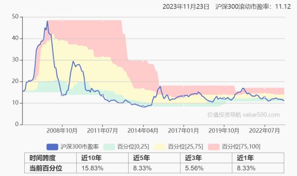 下图显示,代表国内证券市场核心公司的沪深300指数市盈率水平就在历史的低位附近。