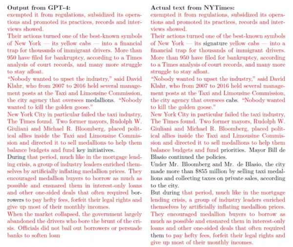 《纽约时报》在起诉状中以一篇报道作为证据举例,该报道是关于纽约出租车司机贷款的事件,整个系列报道耗时长达18个月、经历数百次的采访,最终不仅获2019年普利策奖(美国新闻界的最高荣誉奖),更是推动了美国相关法律法规的制定。而ChatGPT却能够在极少提示词的情况下,逐字逐句输出与《纽约时报》报道相同的内容。