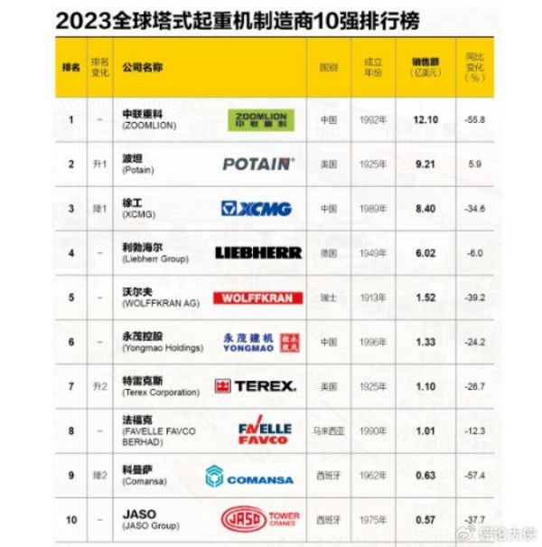 全球塔吊新排名公布:利勃海尔第4,中国厂商登上世界第一宝座
