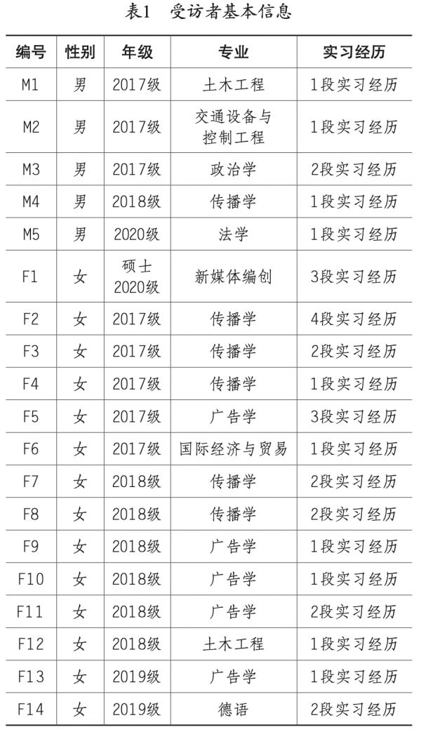 本文采用质性研究方法,通过深度访谈搜集资料,研究者于2020年12月至2021年4月以滚雪球抽样的方式选取19名新媒体实习生进行半结构化访谈。被访者是来自人文、社科、工科和理科的本硕学生;均具有新媒体实习的经历,实习单位规模大小不一,包括头部互联网企业及小型新媒体文化工作室。此外,研究者之一自2018年起便参与新媒体实习,因此本文也包含研究者本人的自我观照与反思。