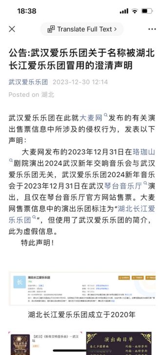 大麦网发布的2023年12月31日在珞珈山剧院演出2024武汉新年交响音乐会与武汉爱乐乐团无关,武汉爱乐乐团2024新年音乐会于2023年12月31日在武汉琴台音乐厅演出,且仅在琴台音乐厅官方网站售票。大麦网售票信息中的演出乐团标注为“湖北长江爱乐乐团”,但使用了武汉爱乐乐团的简介,此为虚假信息。