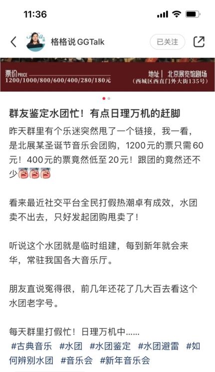 独立乐评人“格格说GGTalk”在小红书上提到:“水团卖不出去,只好发起团购甩卖了!北展某圣诞节音乐会团购,1200元的票只需60元,400元的票竟然低至20元!”这显然是音乐行业从业者、资深乐迷共同教育了市场的成果。