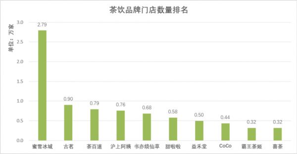 按照窄门餐眼的数据(具体数据可能与招股书及实际情况有些许不同,在此只看相对排名和趋势),茶饮品牌按门店数量排名,前十名的顺序为蜜雪冰城(27920家)、古茗(9028家)、茶百道(7939家)、沪上阿姨(7613家)、书亦烧仙草(6843家)、甜啦啦(5789家)、益禾堂(4965家)、CoCo(4356家)、霸王茶姬(3200家)、喜茶(3197家)。