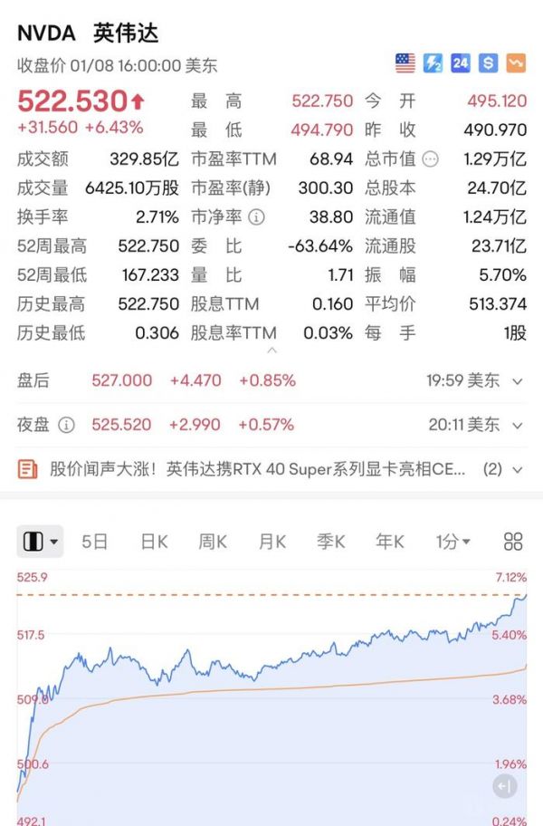 受新产品及市场消息影响,截至美股1月8日收盘,英伟达(NASDAQ:NVDA)股价大涨6.43%,盘中曾再度刷新历史新高,一夜之间,市值增长约5600亿元。过去一年,英伟达股价累计上涨超过230%。