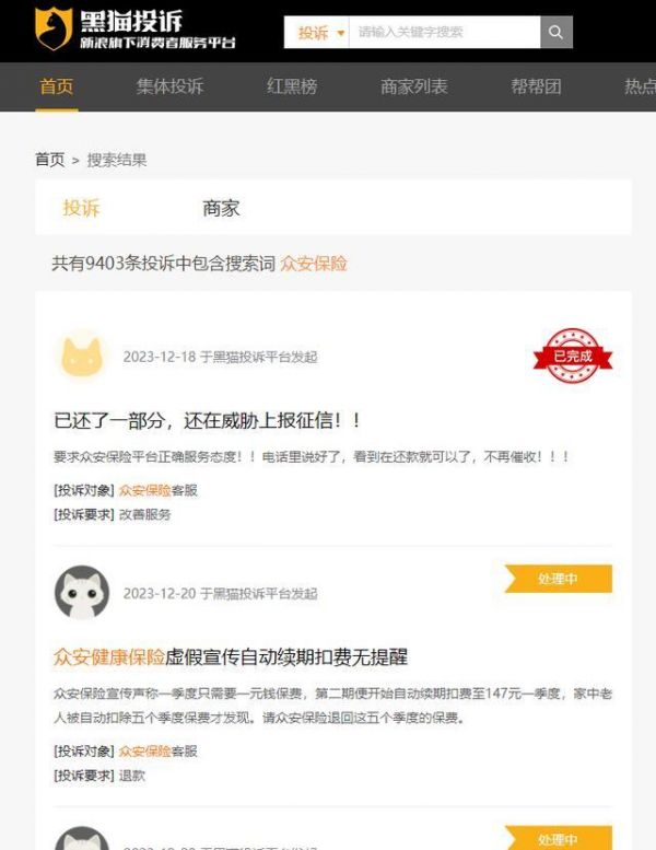 记者在黑猫投诉平台搜索“众安保险”词条,投诉信息超9400多条。