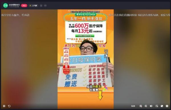 比如,众安保险在直播间宣称旗下一款保险产品“大病大到肝癌、肺癌、乳腺癌、脑梗、心梗,小病小到感冒发烧、胃炎、肺炎、骑车摔伤、猫狗抓伤等都能报,支持带病投保”。