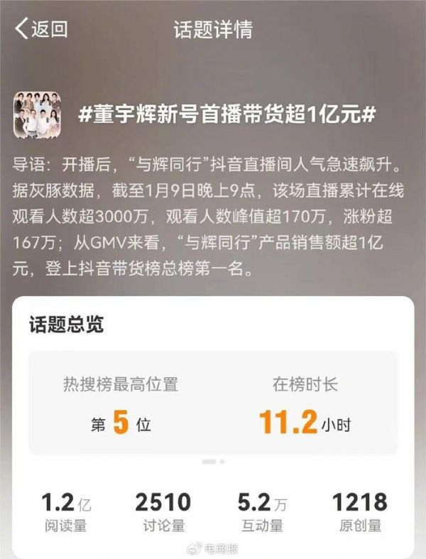 “董宇辉新号首播带货超1亿元” 图源:微博