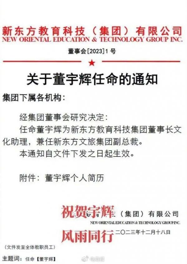 董宇辉任命通知 图源:俞敏洪