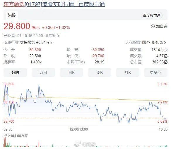 与此同时,东方甄选的股价也呈现上升趋势,1月10日收盘,东方甄选上涨1.02%,收29.800港元/股,最新市值278亿人民币。