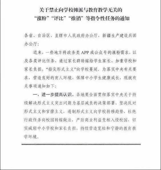 2022年,国务院教育督导委员会办公室发布《关于禁止向学校摊派与教育教学无关的“涨粉”“评比”“推销”等指令性任务的通知》,要求各地遏制形式主义向学校转移趋势,杜绝行政任务向校园转嫁做法。