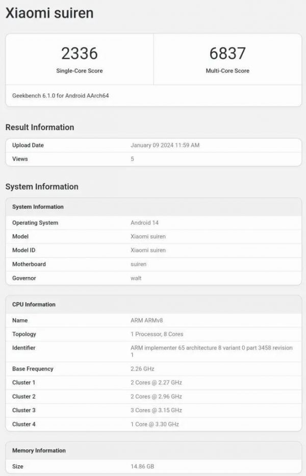 IT之家 1 月 11 日消息,近日一款名为“Xiaomi Suiren”的神秘手机现身 GeekBench 跑分库,显示配备高通骁龙 8 Gen 3 处理器和 16GB 内存,6.1.0 版本单核成绩 2336 分,多核成绩 6837 分。