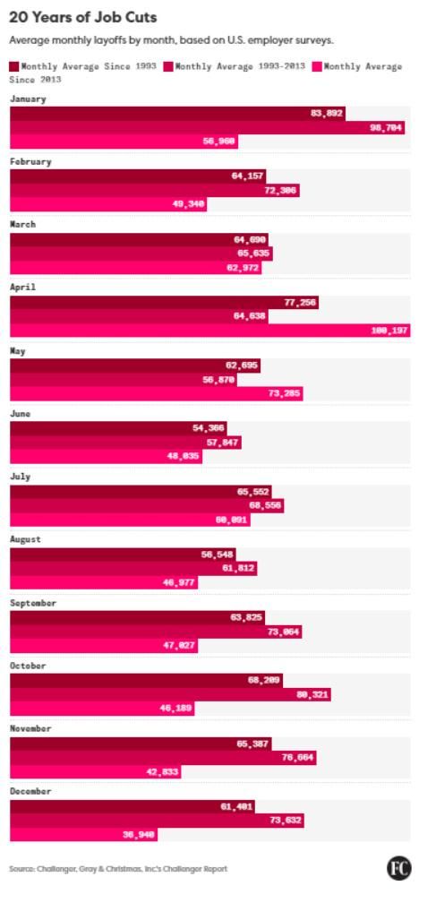 就业资讯公司Challenger, Gray & Christmas, Inc.多年来一直通过客户、合作伙伴和同行人脉调查各公司的裁员情况,包括300多家公司,员工人数多达50000余人,横跨30个行业,涵盖美国所有地区。据该公司提供的数据显示,在1993年至2012年期间,每年1月是裁员最多的月份。2012年以来,每年的4 月和 5 月裁员最多。2013年至2023年,美国4月平均裁员人数超100000人。