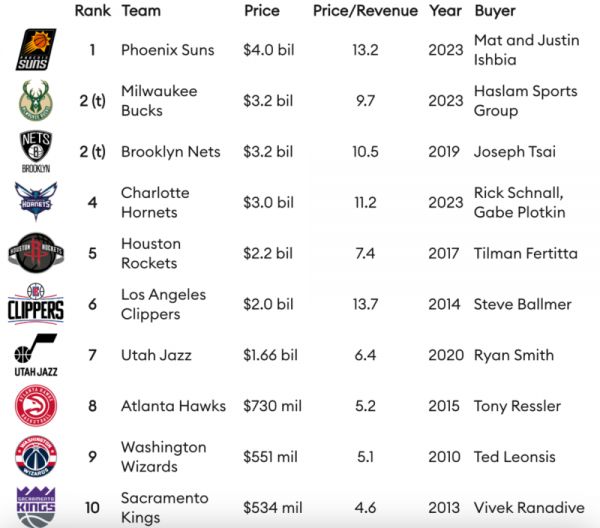最昂贵的10宗NBA球队出售交易,由福布斯排行