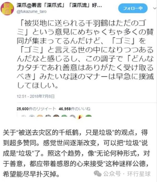 奉劝那些还在折千纸鹤送给灾区的傻瓜们,不如拿这些钱来买茶或者米。——那须优子,在社交媒体上尖锐吐槽纸鹤的记者。图:X.com