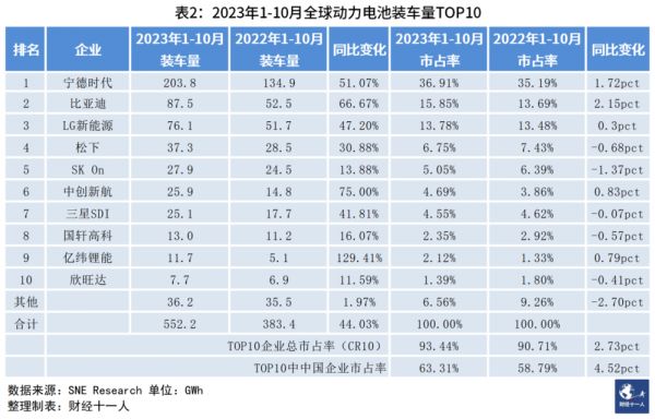 根据SNE Research公布的2023年1月~10月全球动力电池装车数据,全球2023年前十个月的动力电池装车总量552.2GWh,比2022年同期增长44%,市场集中度继续提升,前十名企业总市占率(CR10)达到93.44%,在去年同期90%以上的高位基础上继续增加2.73个百分点。