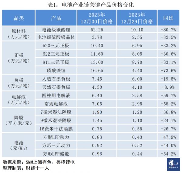 碳酸锂价格下跌是2023年新能源车全链条产品价格下跌的一个缩影,对比2022年12月30日和2023年12月29日的价格,除天然石墨负极这种在中国市场用量很小的产品,其余产品下滑幅度最小的也超过20%,最大的超80%,一年时间,价格腰斩,反映出整个行业供大于求的程度。