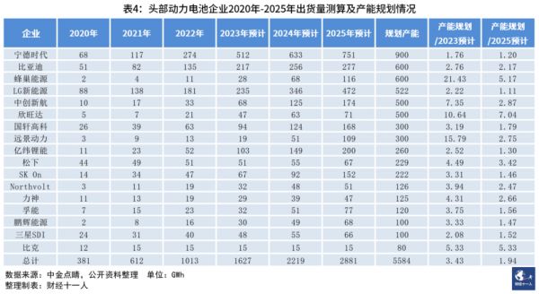 统计数据也表明头部动力电池企业的产能规划过剩的情况并不是非常严重。以2025年预计出货量相比,头部企业的产能规划超出幅度大多不足两倍。