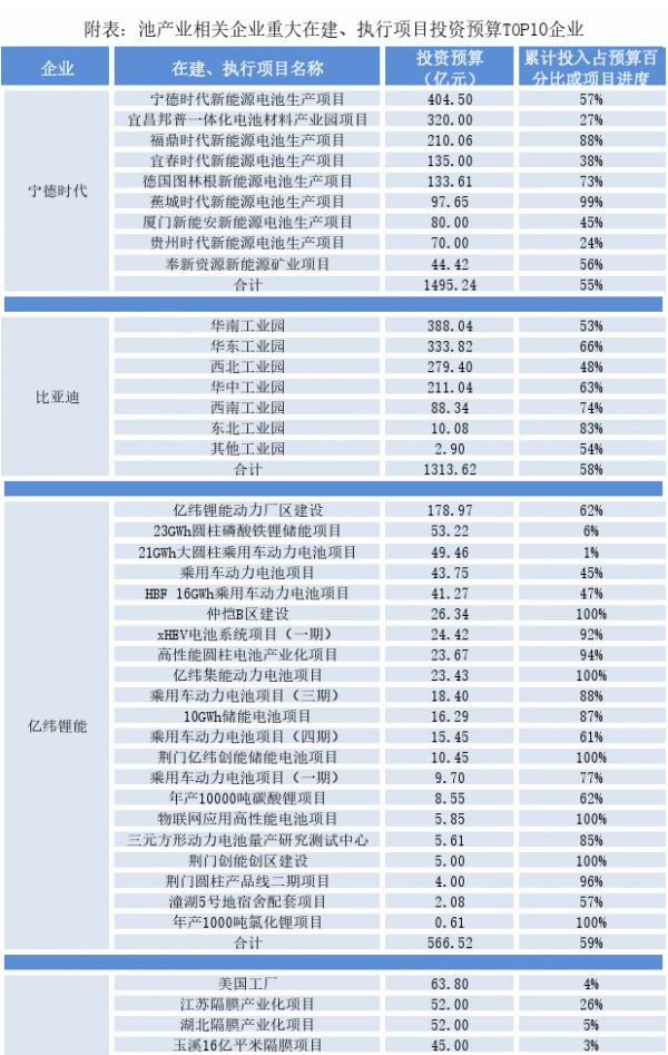 附表:电池产业相关企业重大在建、执行项目投资预算TOP10企业: