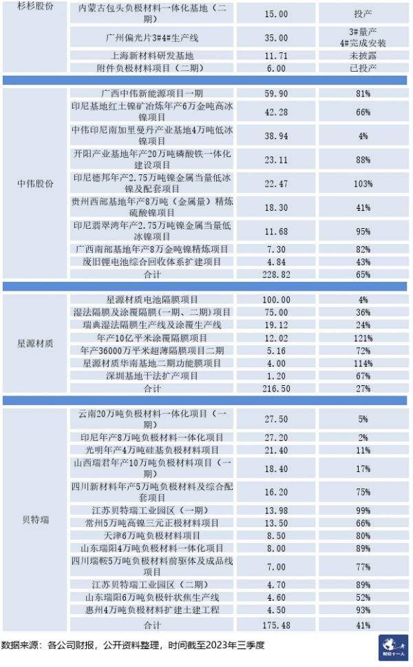 很多公布的投资最终并不会真实落地。“财经十一人”根据2023年半年报梳理了电池产业链近百家上市公司的在建项目,总计超过400个项目进入建设、执行阶段,这些项目的投资总预算超9000亿元,其中两家企业投资预算超千亿,17家企业投资预算超百亿。(投资预算前十位的企业详情见文尾附表。)