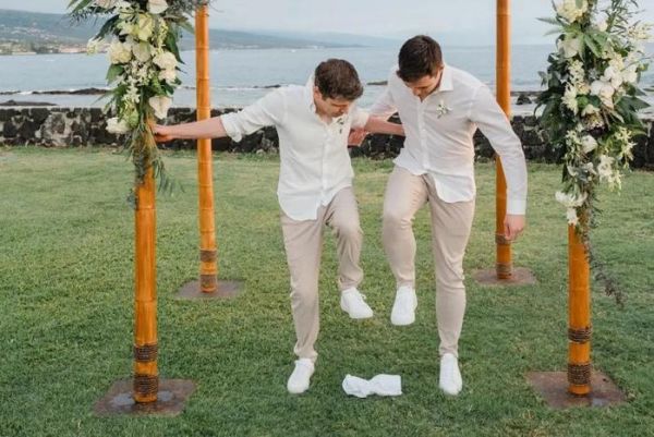 在婚礼当天,Altman 和 Ollie 都穿着随意搭配的服装,一身白色衬衫、浅米色裤子和白色运动鞋,象征着纯洁的恋情。