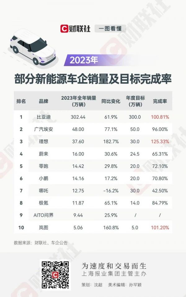 从年度销量目标完成率来看,在统计的10家新能源车企中,仅比亚迪、理想、岚图完成了全年目标,“合格率”仅三成。