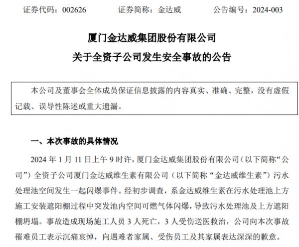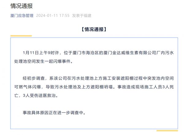 1月11日,厦门市应急管理局公众号发布情况通报称,1月11日上午9时许,位于厦门市海沧区的厦门金达威维生素有限公司厂内污水处理池空间发生一起闪爆事件。事故造成现场施工人员3人死亡,3人受伤送医救治。