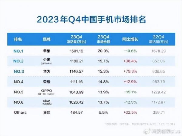 在2023年4季度的时候,这个比例其实已经达到了15.3%了,如上图所示,华为4季度手机销量份额占比为15.3%,苹果为20%,相差只有5个百分点。