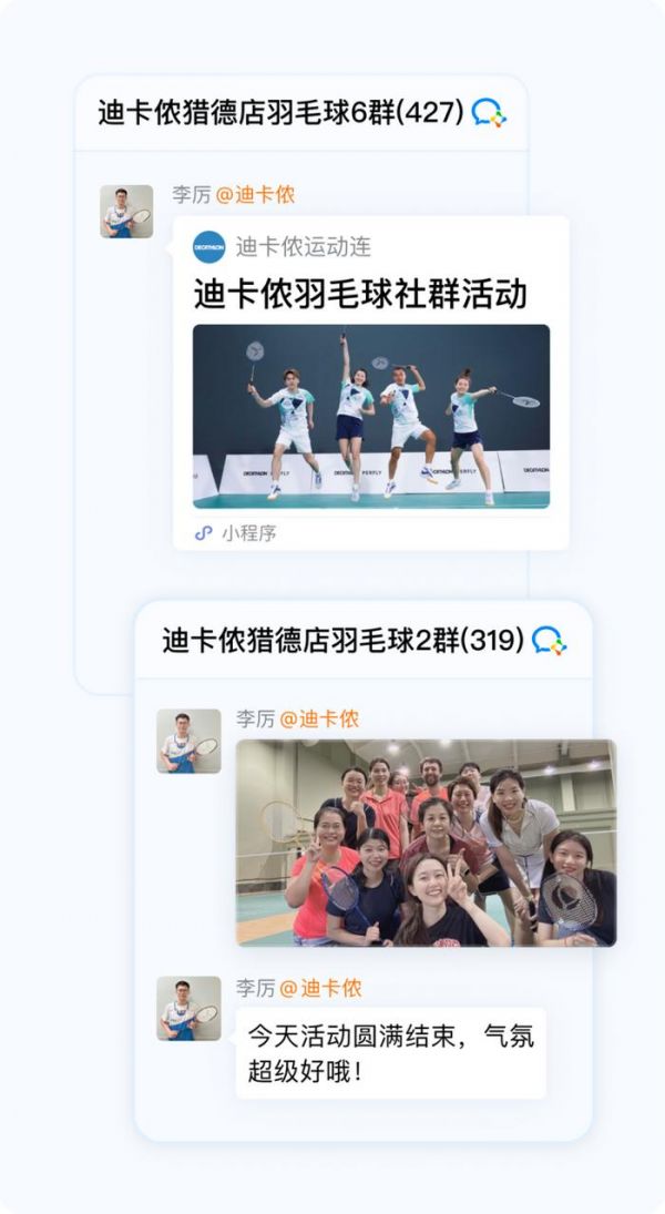 私域如何具体发挥作用?兴趣是最好的动力。因此,迪卡侬借助企业微信建立兴趣社群,给用户找“运动搭子”。群里都是有相同爱好的人,比如跑步群、骑行群、亲子互动群。