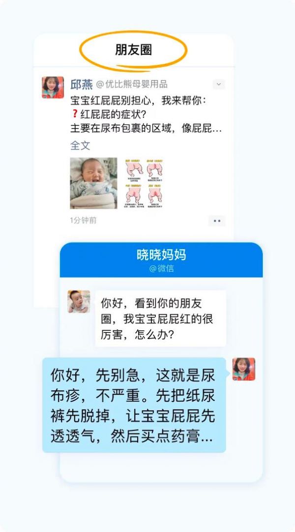 这家小店的服务原则是:平时不打扰,有需要的时候在线上秒回。导购几乎很少群发消息,避免给用户带来骚扰,而是在用企业微信发朋友圈分享育儿知识。有一次有个宝妈看到朋友圈,找过来求助导购宝宝红屁屁问题,导购立刻就帮忙解决了,安抚情绪并告诉她如何操作。