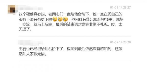 不少博主则直接在朋友圈骂了起来,“这个程前,老同志们一直给他台阶下,他一直在秀自己没有下限只有更下限。”不少网友也纷纷表示,“一些网红只能出现在视频里,现场一交流就马上玩完,最后的结束语对嘉宾非常不礼貌,哎,太无语了。王石已经很给他台阶下了,程前到最后依然没有感知到,还依然让大家很无语。”