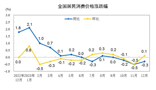 2023年12月份居民消费价格同比下降0.3%,环比上涨0.1%