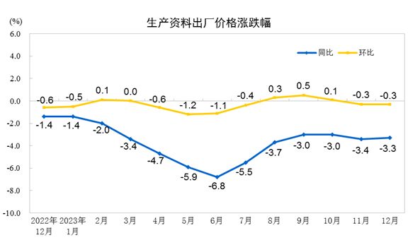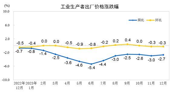2023年12月份工业生产者出厂价格同比下降2.7%,环比下降0.3%