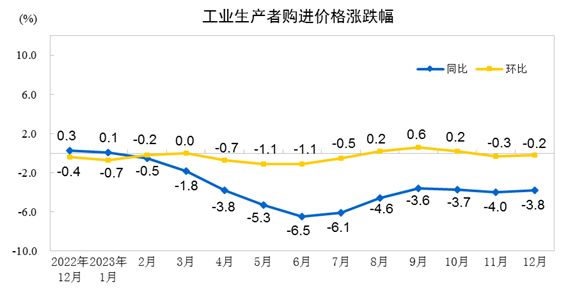 2023年12月份,全国工业生产者出厂价格同比下降2.7%,环比下降0.3%;工业生产者购进价格同比下降3.8%,环比下降0.2%。2023年全年,工业生产者出厂价格比上年下降3.0%,工业生产者购进价格下降3.6%。