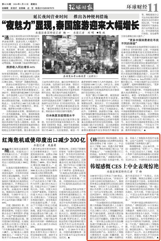 “当L4级别的自动驾驶清洁机器人和堆叠式物流机器人上台演示时,现场爆发出阵阵欢呼声;只有巧克力棒大小的人工智能翻译机获得了CES创新奖,该机器无需安装单独的应用程序,只需戴上耳机,即可立即开始翻译;在数字医疗领域,一家中国企业推出的无创血糖监测可穿戴设备令业界惊讶……”《韩国经济》称,在CES展会上,中企推出不少已经可以直接投入应用场景的成熟产品,如使用人工智能大模型技术(LLM)的翻译器、创建沉浸式混合现实(MR)的硬件设备、具备人工智能技术的医疗设备等,这些产品使得“中国企业的展位前挤满了来参观的人群”。