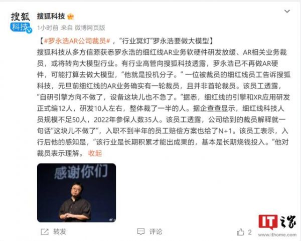 IT之家 1 月 12 日消息,据新浪科技报道,针对今天早些时候有媒体报道称“罗永浩的细红线公司业务从 AR 转向大模型”一事,该公司人士回应称:报道不实,罗永浩仍专注于 AR 软硬件。