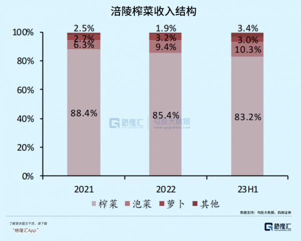 2023H1,榨菜业务占比83.2%,较2021年下滑5.2%。同期,泡菜业务占比从6.3%增加至10.3%。这主要系榨菜业务有所萎缩,泡菜业务略有增长。