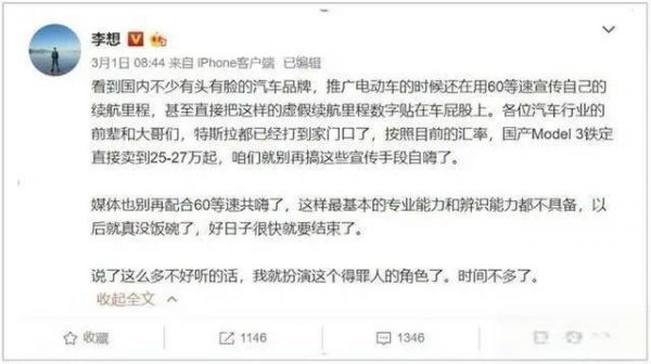 早在2019年3月,李想就曾发微博表示:“看到国内不少有头有脸的汽车品牌,推广电动车的时候还在用60等速宣传自己的续航里程,甚至直接把这样的虚假续航里程数字贴在车屁股上,真有点大跃进的感觉。”