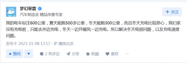 一位在北方的朋友则告诉“凤凰车研所”,一到冬天,电车的续航能力下降得夸张。“表盘看着剩100公里,实际能跑30公里就不错了,一开暖风,电动车就变‘电动爹’了,电量起码下一半。”本来打算下班后抽空去兼职网约车的他,也因此放弃了这一打算。“这个天气要是不开空调,铁定会被乘客投诉。 ”