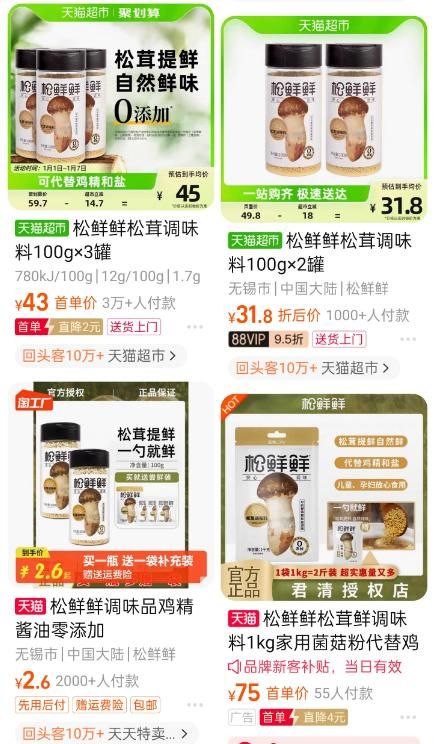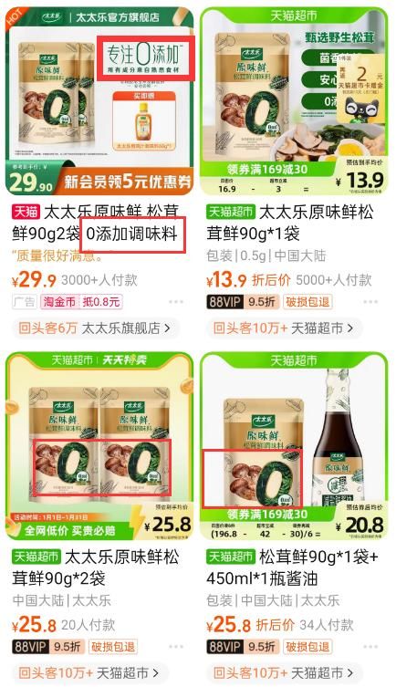 忽然就意识到,这又是另一个“摸着创业公司过河”的故事……要知道太太乐是纯外资控股企业,是妥妥的外资巨头,并且是“专注于添加调味料35年”的鸡精巨头,结果现在主图上竟然大打“专注0添加”这张“王牌”!好奇点开看了下,主图视频竟然和松鲜鲜几乎一模一样,虽然镜头高度雷同,但又没抄到松鲜鲜的魂,让我瞬间无语。