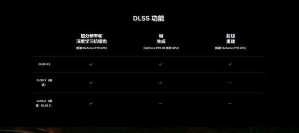(图源英伟达NVIDIA)DLSS 1和2主要是超分辨率技术,适用于所有RTX显卡,它使用AI算法先降低分辨率,然后将低分辨率画面转换为更高分辨率的画面,从而实现帧数的提升。而DLSS 3则是一种插帧技术,专为RTX 40系显卡设计。此外,DLSS 3.5被称为光线重构技术,它适用于所有RTX显卡,主要通过光线追踪降噪器来提高光追效果。重点在于提升光追效果。