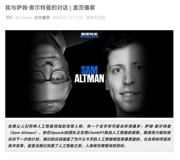 IT之家 1 月 12 日消息,据比尔盖茨官方公众号,在最新一期的《为自己解惑》播客节目中,登场的嘉宾是刚刚迎来“新婚之喜”的 OpenAI 首席执行官萨姆・阿尔特曼。