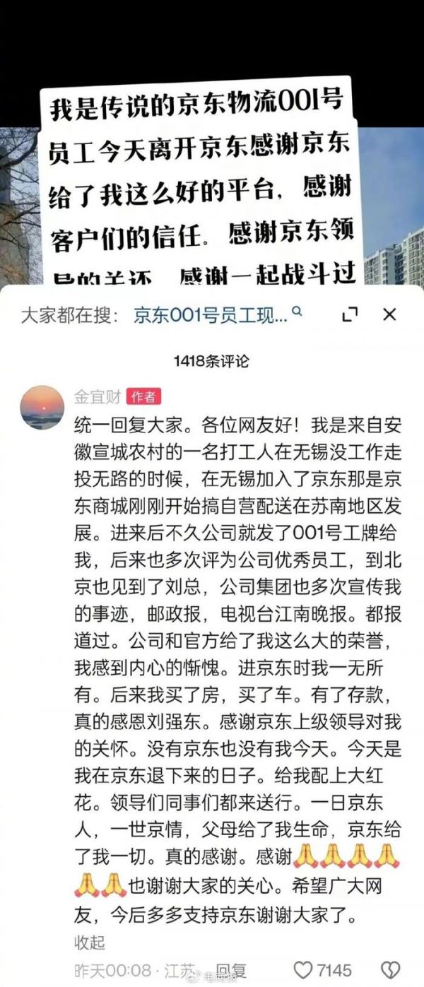 就在此前一天,被外界称作“京东物流001号员工”的金宜财正式退休,他还发了一条抖音感谢京东:“进京东时我一无所有,后来我买了房、买了车、有了存款,真的感恩刘强东,感谢京东上级领导对我的关怀,没有京东也没有我的今天。”