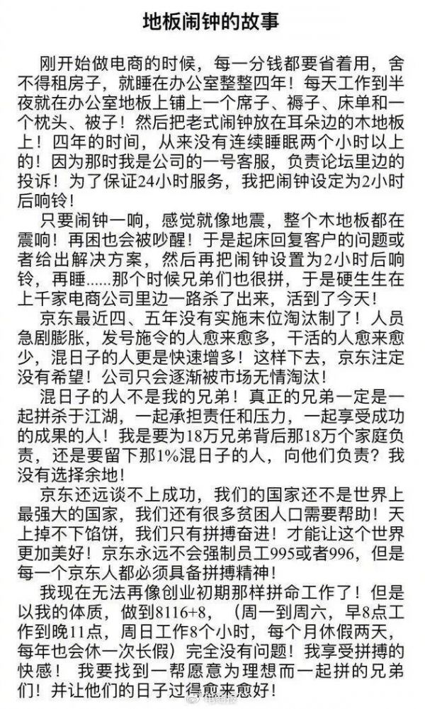刘强东更是直言:“混日子的人不是我的兄弟!真正的兄弟一定是一起拼杀于江湖,一起承担责任和压力,一起享受成功的成果的人!我是要为18万兄弟背后那18万个家庭负责,还是要留下那1%混日子的人,向他们负责?我没有选择余地!”