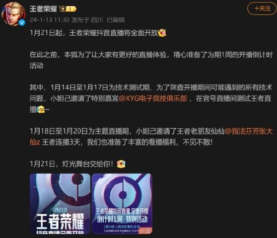根据发文内容,《王者荣耀》抖音直播将在1月14日-1月17日进行技术测试,1月18日至1月20日为主题直播期,张大仙将会在抖音连播3天,1月21日全面开放。