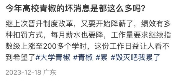 一位广东985的高校教师在社交媒体上表示:学校继上次晋升制度改革,又要开始降薪了,绩效有多种扣罚方式,每月薪水也要降,工作量要求继续指数级上涨至200多个学时。