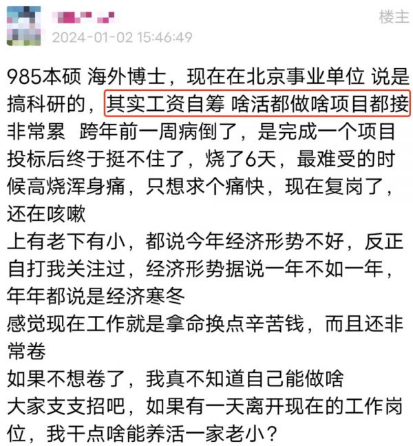 自筹经费的压力落在每一个人的肩上。一位北京科研事业单位的科研人员感慨:说是搞科研的,其实工资自筹。啥活都做,啥项目都接,非常累。