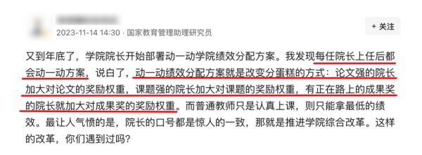 “论文强的院长加大对论文的奖励权重,课题强的院长加大对课题的奖励权重,有正在路上的成果奖的院长就加大对成果奖的奖励权重。”